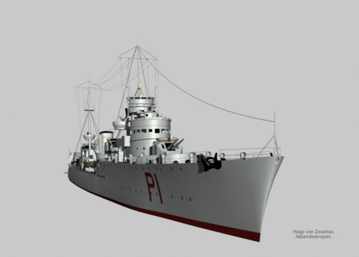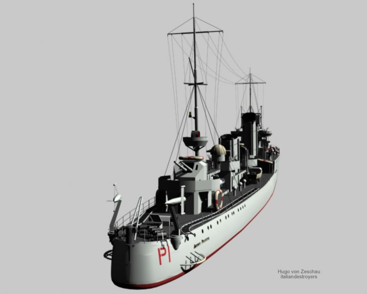 The remaining units in 1942 and their service in the War They fought in the World War Two, but suffered heavy losses during the conflict. Only one vessel survived, six ships were lost against other ships by gunfire in the escort duty. Alvise Da Mosto: In the Regia Marina service since 1930. She was sunk in December 1941 during a night combat with British units near Tripoli. Antonio Da Noli: She entered in the Regia Marina service in 1929. In 1942 she was refitted and received a new anti aircraft armament in place of the after torpedo tubes that were replaced with two 37/54 singles, and seven 20/65 singles replaced the four obsolete twin 13.2mm. After the armistice she was damaged at a mine field and consequently scuttled by her crew. Nicoloso Da Recco: In the Regia Marina service since 1930. In December 1942, in a fight with English units she was heavily damaged. Later in 1942 during the reparations work, she was refitted and received two 37/54 anti aircraft singles in place of the disembarked after torpedo tubes, and nine 20/65 singles replaced the four older twin 13.2mm. An Italian radar EC3 ter/ Gufo was also installed. The Da Recco was the only class survivor at the end of the war and she was utilized in the Marina Militare service until 1954. Lanzerotto Malocello: In the Regia Marina service since 1930. In 1942 she was present in the battle of Pantelleria. In the same year she was refitted and received a new anti aircraft armament in which were disembarked the after torpedo tubes and replaced with two 37/54 singles, and seven 20/65 singles replaced the four obsolete twin 13.2mm. She also received a German Radar "De.te" and turn into one of the few Italian destroyers to receive that equipment. She was sunk in March of 1943 by a mine near Cape Bon during a troop transport mission to Tunisia together with the destroyers Ascari, Pancaldo and Camicia Nera. Leone Pancaldo: She entered in the Regia Marina service in 1930. When the war begun she was employed as Fleet destroyer, after she have participated of the battle of Punta Stilo she was sunk by air attack but after recovered she had a long refitted period until December 1942. In these refit she received new anti aircraft armament in which were disembarked the after torpedo tubes and replaced with new 37/54 singles, and nine 20/65 singles replaced the four older twin 13.2mm. She also received an Italian Radar EC3 ter/ Gufo. She was sunk in April 1943 by air attack during a troop transport in voyage to Tunisia. Emanuele Pessagno: She entered in the Regia Marina service in 1930. The Pessagno was sunk on May 1942 by a submarine near the Libyan coast. Antonio Pigafetta: In the Regia Marina service since 1931. In 1942 she was refitted and received a new anti aircraft armament in place of the after torpedo tubes that were replaced with two 37/54 singles, and seven 20/65 singles replaced the four obsolete twin 13.2mm. After the armistice she was captured by the Germans and renamed TA-44 during her German service. She was sunk by air attack in January 1945 in the port of Trieste. Luca Tarigo: In the Regia Marina service since 1929. During this service, in April 1941, while escorting a convoy with other destroyers sustained a night fight with British warships; she was sunk, but not before to sink the Mohawk. Antoniotto Usodimare: In the Regia Marina service since 1930. In 1942 she was refitted and received a new anti aircraft armament: their 13.2mm binate were replaced with seven 20/65 singles. She was torpedoed by error by an Italian submarine in June 1942. Giovanni Da Verazzano: She entered in the Regia Marina service in 1930. In 1942 her anti aircraft equipment was modernized and received two new Breda37/54 singles, and seven Breda 20/65 singles. In a convoy escort mission she was torpedoed near Lampedusa on October 1942. Ugolino Vivaldi: In the Regia Marina service since 1930. Her modernization work in 1938 fixed the design lines of the modernized Series 2. She was heavily damaged at the Battle of mid June in 1942, when Italian ships attacked an allied convoy. She was repaired in a refit that includes the installation of better anti aircraft armament, two Breda 37/54 singles and nine Breda 20/65 singles. In 1943 was planned to incorporate radar equipment but the armistice suspended these plans. She was sunk on September 1943 by German coastal batteries in Corsica. Nicoló Zeno: In the Regia Marina service since 1930. In 1942 she was refitted and received two 37/54 anti aircraft singles in place of the disembarked after torpedo tubes, and seven 20/65 singles replaced the four older twin 13.2mm. At the surrender of Italy she was still at work and was scuttled by her crew.